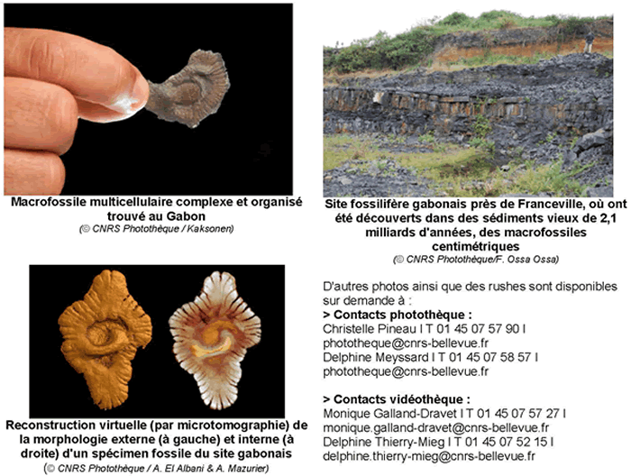 Les plus anciennes traces de vie complexe connues à ce jour sur la Terre ont été découvertes au Gabon, dans la province du Haut-Ogooué. Elles sont datées de 2,1 milliards d’années. C'est en 2008 que l’équipe scientifique dirigée par Abderrazak El Albani a découvert plus de 250 fossiles pluricellulaires dans le bassin sédimentaire francevillien. Ces spécimens du début du Protérozoïque sont de diverses formes et mesurent entre 10 à 12 centimètres. |